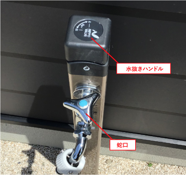 12月より3月・お彼岸前まで、冬期の水道管凍結防止のため、墓地内の水道を止水しています。駐車場・東屋内の水道のみ使用できますが、使用の際は蛇口ではなく、蛇口の上部にある「水抜きハンドル」を回してください。またご使用後も、蛇口ではなく「水抜きハンドル」での止水をお願い致します。